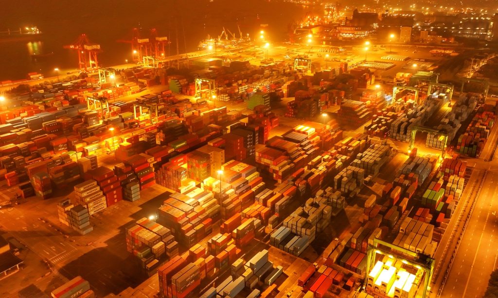 At the container terminal of Zhangjiagang Port Area in Suzhou Port, East China's Jiangsu Province, container trucks shuttle back and forth on March 5, 2026, presenting a scene of bustling activity. Photo: VCG